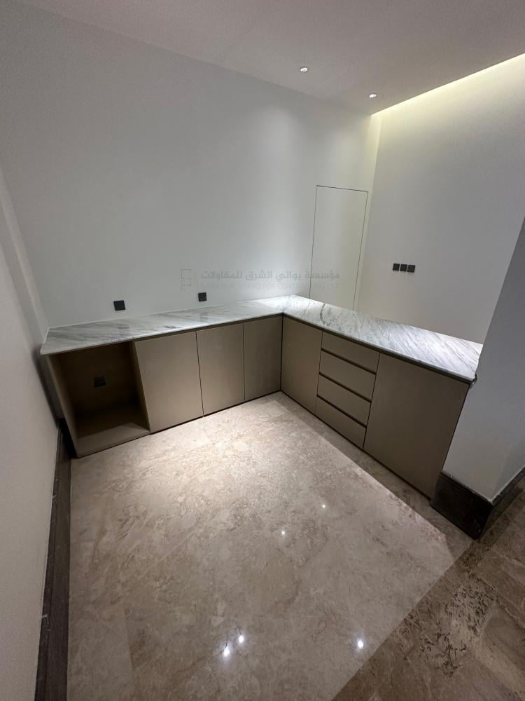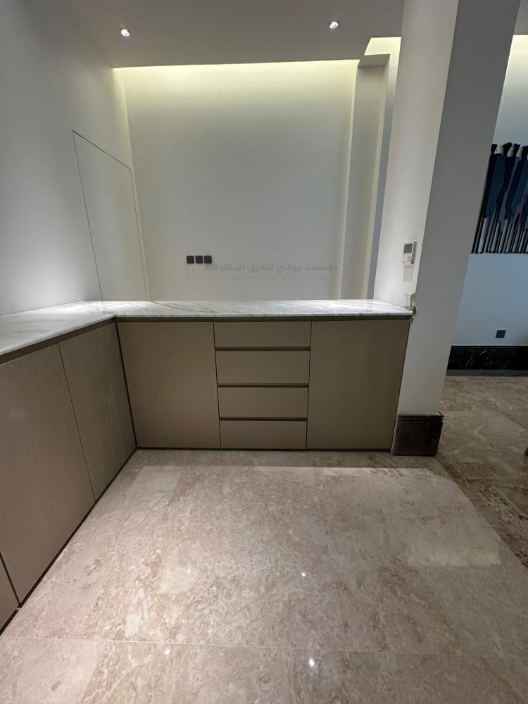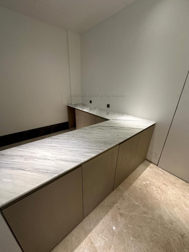 تصميم فريد ومميز : البوفيه يتميز بشكله المميز على شكل حرف L مع سطح من الرخام الطبيعي ودولاب خشبي يجمع بين الفخامة والعملية.