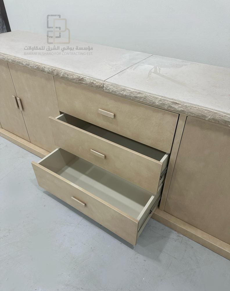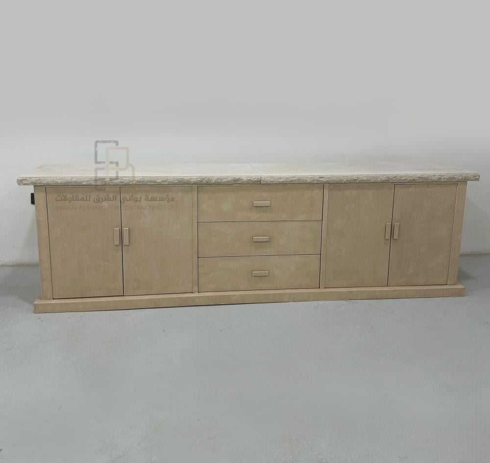 بوفية أنيق يجمع بين فخامة الحجر الطبيعي وأناقة التصميم الحديث. تم تصنيعه من الحجر الطبيعي الفاخر، ليضيف لمسة جمالية فريدة إلى ديكور منزلك بلمسات طبيعية وعروق مميزة تعكس رقي الذوق.