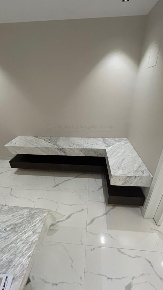 تصميم فريد ومميز : البوفية يتميز بشكله المعلق على شكل حرف L مع سطح من الرخام الطبيعي ورف سفلي خشبي يجمع بين الأناقة والعملية.