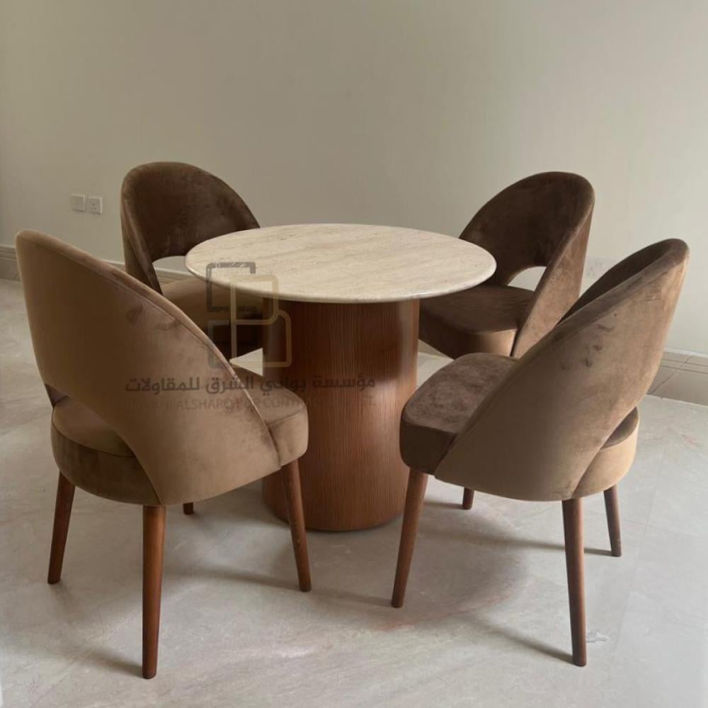 أضف لمسة من الفخامة والجمال إلى غرفة طعامك مع طاولة الطعام الفاخرة من رخام ترافنتينو بيج الطبيعي والقواعد الخشبية! اطلب الآن واستمتع بجودة الصناعة السعودية مع ضمان 5 سنوات.