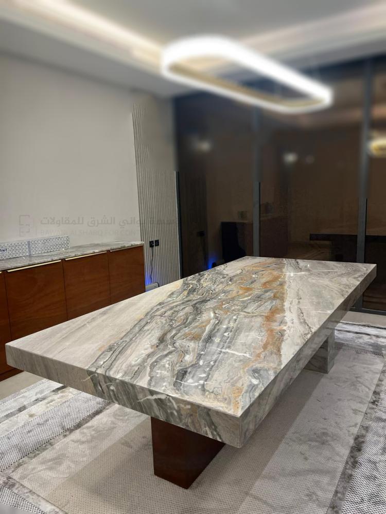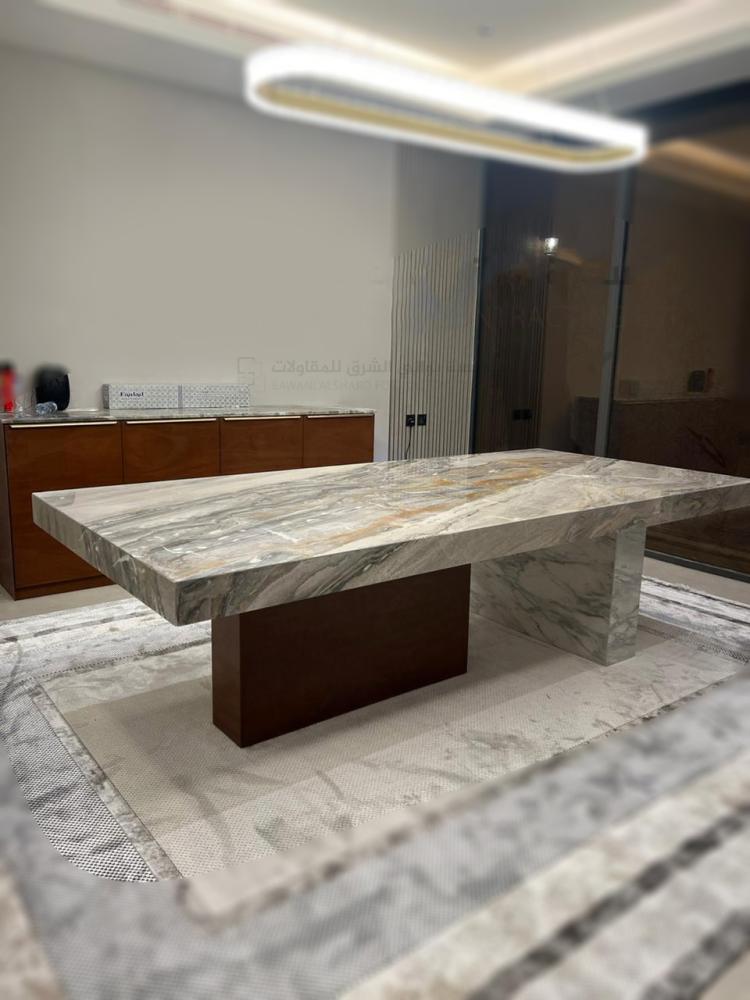 تصميم فريد ومميز : الطاولة تجمع بين جمال الرخام الطبيعي وأناقة الخشب الطبيعي في قطعة واحدة.