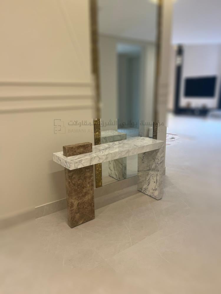 تصميم فريد وفخم : الكونسول يتميز بسطحه المصنوع من الرخام الطبيعي وقواعده الرخامية التي تعكس الفخامة والأناقة.